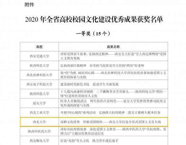 日前,省委教育工委下发了《关于表彰2020年全省高校校园文化建设优秀成果的通报》,我校报送的《深耕文化优势 厚植爱国情怀——西北大学打造全景式爱国主义育人场》获一等奖。这是自2009年以来,我校连续第十一次获此殊荣。