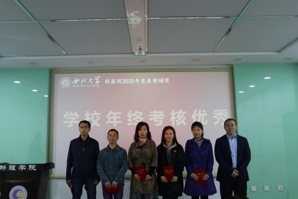 会上,全体人员观看了校医院2020年度工作汇报专题片,校医院负责人宣读了2020年度先进工作者获奖名单,常江等为疫情防控和医院各项工作中涌现出的先进个人颁奖。