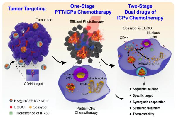 研究发现,天然抗肿瘤药物棉酚(gossypol)和绿茶多酚(EGCG)与金属离子无限配位后颜色变深,吸收光谱发生了变化,具有了一定的光热转换能力,在掺杂一定比例的光热剂IR780后,其光热效率从16%大幅增加为47.8%,使这种ICPs同时具有了光热治疗和ICPs双药化疗的能力,体系具有一物多用的特点。此外,由于ICPs中各药物释放顺序不同,使得肿瘤治疗可以按照不同阶段顺序进行。