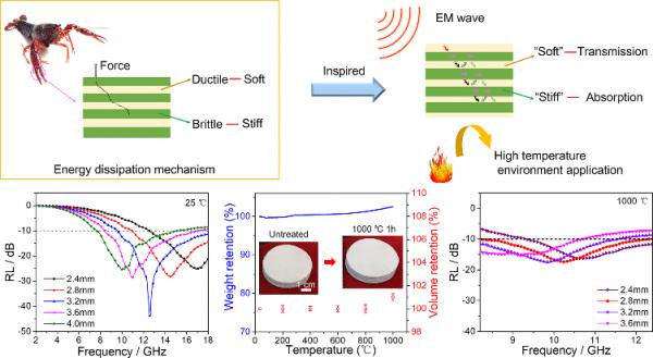 为此,西安交通大学王红洁教授团队借鉴仿生龙虾壳层状结构对机械能量的衰减机制,以纸状SiC和Si3N4气凝胶为基本构筑单元,进行交替多层透波/吸波结构设计,构筑具有优异室温/高温吸波性能和超低密度的复合气凝胶:一方面利用透波材料降低材料与环境的阻抗,另一方面利用透波/吸波交替结构将电磁波限制在材料内部,并将其损耗,起到“关门打狗”的效果,最终获得低介电、高损耗的高性能陶瓷气凝胶吸波材料。此外,该材料还具有陶瓷气凝胶的优异隔热性能。