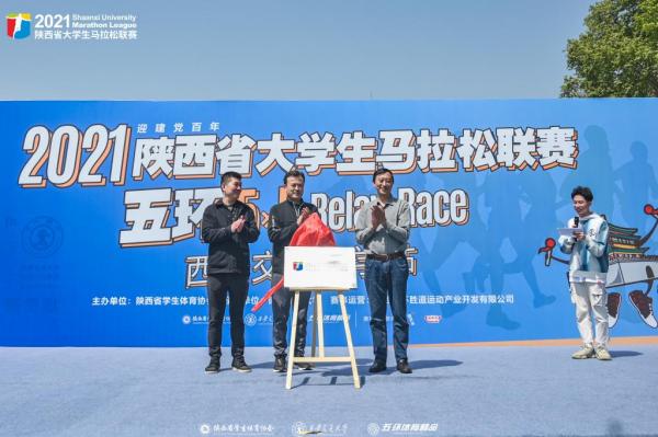 当日下午,在正式鸣枪开跑之前举行了2021陕西省大学生马拉松联赛揭牌仪式,陕西省学生体育协会竞赛部主任石赛佳、西安交通大学体育中心主任刘长江、陕西五环胜道运动产业开发有限公司招商部总监孙骑共同为联赛揭牌。