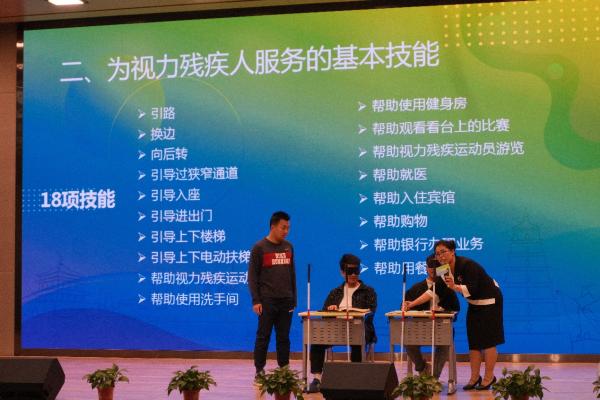 西安市莲湖区残疾人服务组织促进会创办人会长、陕西省西安残疾人福利基金会推广大使、民政部社会组织管理培训师惠娜,在残疾人服务主题培训中示范了如何服务肢体残障人士,并且带领全体志愿者学习了简单的手语,以更好地服务听力残疾人。