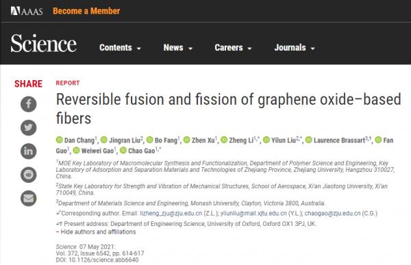 为了实现人工装配体的可逆融合与分裂,西安交通大学航天航空学院刘益伦教授团队联合浙江大学高分子系高超教授团队联合提出了一种溶剂触发的形貌调控策略,以氧化石墨烯(Graphene oxide , GO)纤维为模型,实现了可逆的融合与分裂。相关成果于5月7日发表在《科学》杂志上。
