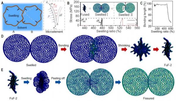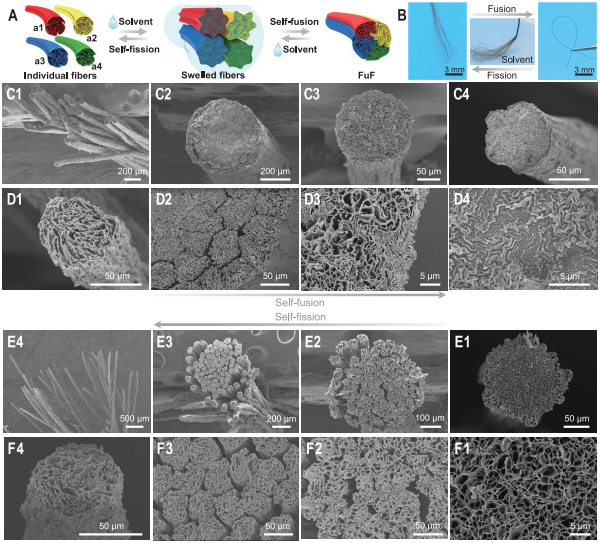 有限元模拟研究和理论分析研究了两根纤维的融合和分裂过程(如图2所示)。对于纤维融合过程,揭示了多孔核-壳系统失水收缩导致的壳层失稳过程以及毛细力诱导的纤维褶皱缝合机理;而对于纤维分裂过程,揭示了溶胀纤维几何形状会产生的界面分离驱动力(如图2A所示)。