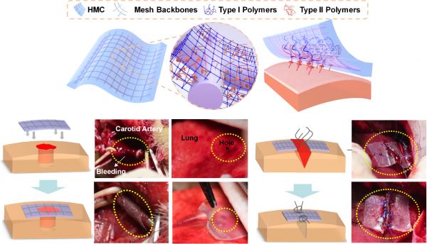 针对这一问题,西安交通大学机械结构强度与振动国家重点实验室、航天航空学院软机器实验室卢同庆教授及高扬副教授与哈佛大学锁志刚院士提出了一种水凝胶复合补片医用新材料(Hydrogel-mesh composite, HMC)。通过将抗溶胀组织黏附水凝胶与外科补片以宏观拓扑互穿结构进行复合,得到的水凝胶复合补片在与组织形成强粘接的同时,还综合了水凝胶及外科补片的优点,如生物相容性、对水及小分子的可渗透性,高的面内刚度及低的弯曲刚度等。这种水凝胶复合补片在组织修复、密封、止血和无缝线创口闭合方面,特别是在承受高应力组织之上的应用中表现出巨大潜力。