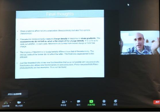 本次会议的10余次邀请报告,内容涉及挠曲电领域中力、电、光、热等多个研究方向,参会专家均为国内外挠曲电相关研究领域的权威专家。其中美国休斯敦大学Pradeep Sharma教授对挠曲电研究的理论及应用,尤其针对软物质当中挠曲电效应的力学模型和理论分析进行了介绍;巴塞罗那纳米科学与技术研究所Catalan教授展示了挠曲电和挠曲电电子学的相关工作;南方科技大学李江宇教授介绍了用AFM对挠曲电效应进行表征的一系列工作;香港理工大学戴吉岩教授讨论了钙钛矿氧化物及其异质结构中的光电挠曲电效应和界面挠曲电效应;同济大学庄晓莹教授介绍了纳米结构挠曲电效应的多尺度模拟和优化;浙江大学王杰教授展示了应变和应变梯度对铁电材料拓扑畴结构的影响。