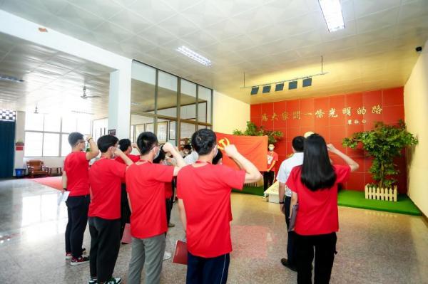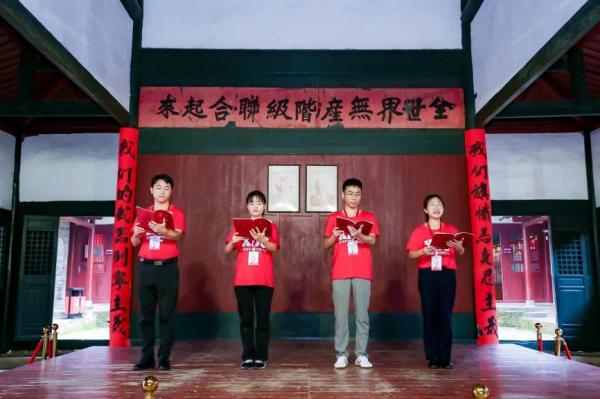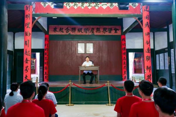 在长汀县博物馆大礼堂,实践队员通过“为新生颁发校徽”“书记讲校史故事”“开学第一课”“师生同台朗诵”“学生代表发言”“校址唱校歌”等环节,重温了1931年中革军委无线电学校“开学典礼”,以“沉浸式”教学模式提升学习教育的针对性、实效性与获得感,推动党史学习教育不断走深走实。