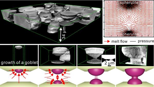 为了揭示三维空间中高聚物结晶形态的演变规律,西安交通大学功能软材料创新团队的Goran Ungar教授基于双光子显微成像技术开发了针对高聚物及其纳米复合材料体系的三维成像技术,成功获得了高聚物球晶的三维图像,并且揭示了纳米粒子在结晶性高聚物中的分散状态。通过对等规聚丙烯(iPP)和聚乳酸(PLA)结晶形态的三维成像研究,意外发现静态结晶条件下产生了类似“碗”、“花瓶”、“圣杯”等不同于球晶的结晶形态(如图所示)。这种非球状的结晶形态打破了人们对经典高分子物理中静态条件下高聚物结晶形成球晶的认知,进一步研究揭示了非球状结晶形态源自于薄膜上下表面两球晶的成核和生长,球晶生长前沿“depletion”区域的负压作用产生局部熔体流动,诱导球晶之间产生线状排核,最终生成C¥对称性结晶形态。本工作不仅丰富了高聚物结晶理论,对于高聚物产品的成型加工也有重要指导意义。