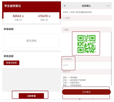 严格返校手续,下好疫情防控“先手棋”。根据疫情防控要求,学校提前升级返校系统和“健康卡”系统,规范学生返校材料要求。学工部门提前向每一名学生“点对点”发送返校通知,告知返校安排和注意事项,指导学生在系统中填报“近14日生活轨迹”和体温信息,上传证明材料。学生返校申请经相关学院/书院审批后才可返校。