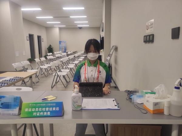 作为志愿者,连梓竹参加过两场比赛,分别是U14的比赛和跳水的正赛。在U14的时候,她是观众服务处的一名志愿者,负责引导观众,维持现场秩序;在跳水正赛时,她在医疗保障处,是一名兴奋剂检查陪护员,需要每天在比赛结束后一直陪护当天被检查的运动员,直到他们顺利进站。