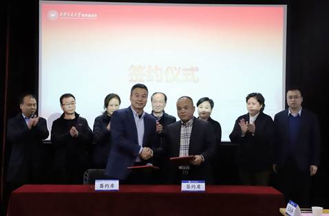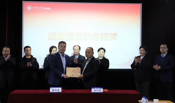 教育基金会秘书长赵卫滨与捐赠方代表徐尉军董事长签署捐赠协议,接受捐赠支票,并代表学校向徐尉军董事长赠送捐赠纪念铭牌。