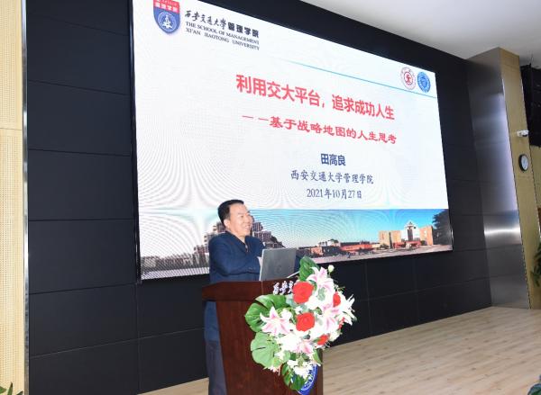 管理学院副院长田高良教授以“利用交大平台,追求成功人生——基于战略地图的人生思考”为题致辞。他表示,未来社会竞争将从核心竞争力转为平台之间的竞争,小成功靠自己,大成功靠众人、靠平台,平台管理就是要不断升级我们的平台,超越“天花板”,突破新的格局,最终使我们达到头顶一片蓝天,脚踏一方热土的境界;要追求多元化成功,做有价值的人——为单位创造价值,为家庭构建和谐,为社会做出贡献;要不断培养“敬业”“职业”“专业”“创业”的四业精神,传承西迁精神,做新时代西迁精神新传人。