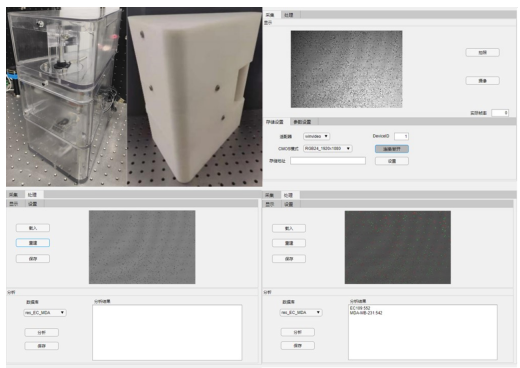 该作品基于无透镜计算显微成像原理,利用物光和参考光干涉,由探测器记录样本的波前信息,再用开发的图像重建算法对采集图像进行重建,得到细胞的振幅或相位图像,之后通过神经网络区分出癌细胞和正常细胞。该作品能够以毫米级大视野、微米级空间分辨率进行成像,成像速度可达20fps,可实现活细胞的无标记非侵入的高通量计数与分类。作品系统结构简单,操作便携,成本低,对于提升现有细胞分析技术具有重大意义。
