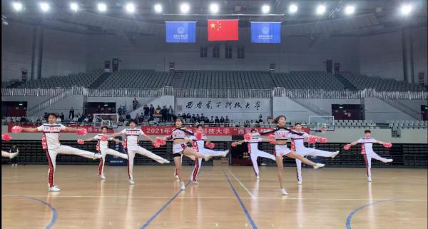 在决赛开始前,校PGF啦啦操队为决赛队员和现场观众献上了专业级的表演,翻转、腾空、托举,集体的青春活力点燃了现场氛围。