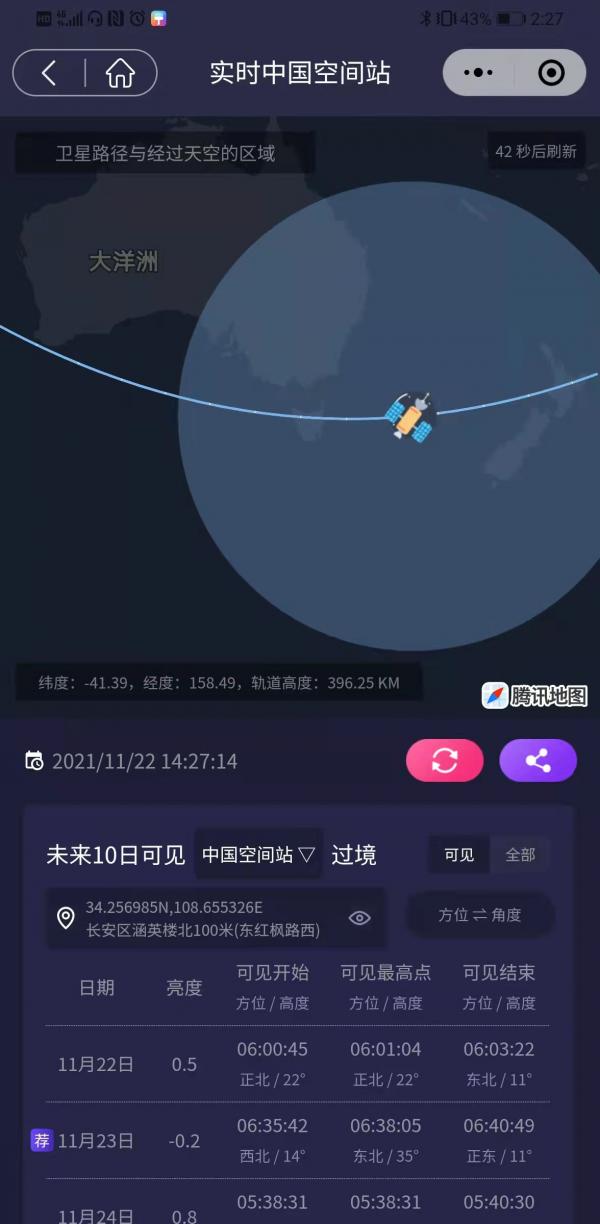 想到了就去做。任雨枫在“天文通”小程序里查到了中国空间站飞过中国西部科技创新港的时间、角度、亮度等信息,并在学校一个摄影爱好者群里“冒了个泡”——“想去拍中国空间站飞过中国西部科技创新港,有人和我一起吗?”来自航天学院的杨玺、化工学院的郭靖宇积极响应了,三位同学约好11月13日凌晨5点多在C区宿舍楼顶拍摄,并进行了一些前期准备。