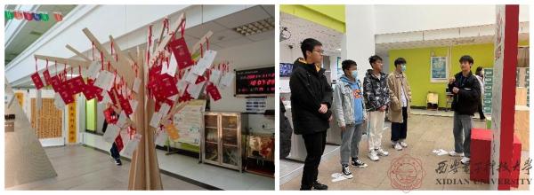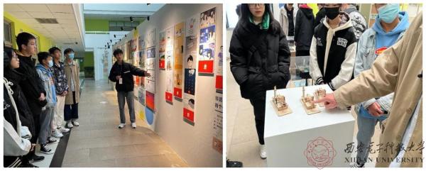 在讲解员的带领下,同学们欣赏了以生动近人的方式,拉开时代幕布的“毛泽东和西电的故事”;将视频与绘画相结合,用数字化形式为作品注入时代灵魂的“智绘西电”;大学生艺术团书画摄影艺术中心以“9”为主要元素,集体创作的九米手绘作品《同庆九秩 逐梦百年》;以及极具西电元素的剪影纸雕灯、电路板学士帽、橡皮软刻章等艺术作品。并在互动体验区,敲击“AI电”发报机,以摩斯电码发出西电式告白,用“新意”传递“心意”。
