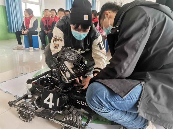 学院高度重视与钤铒小学的对接帮扶工作,依托学院特色探索并打造了系列科普课程。来自西电“Irobot”机器人战队的两位同学通过展示步兵机器人,为孩子们上了一堂别开生面的科技体验课。两位同学全方位讲解了机器人的结构和操作方式,并作了发射小球的演示,激发了孩子们极大的兴趣。在两位同学的引导下,每个孩子都体验了操作机器人的快乐和新奇。在欢声笑语中,进一步加深了孩子们对科技、机械的认识。