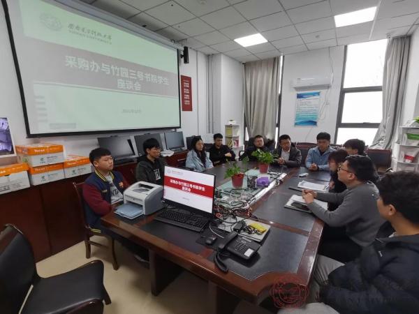 由于采购办有重要招标项目,采购办由部分工作人员接待到访的同学。首先,同学们跟随田宪老师来到了投标评审的标室进行一些相关知识的讲解与答疑。座谈开始前,田老师贴心地询问了同学们对相关部门的了解情况以及日常的学习生活,同学们也都热情地反映了自己的实际情况,现场的气氛十分融洽。
