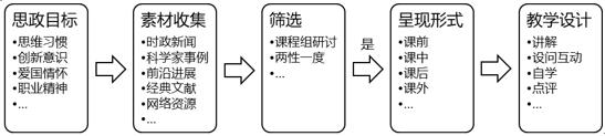 将课程思政写入课程建设规划和要求,每章节按照建设目标收集、挖掘时政新闻、历史故事、前沿进展等思政案例和素材,形成思政元素库。课程组开展专项讨论对思政元素进行筛选,把握好思政教育与专业知识的比例。选择好课堂教学的切入点和呈现形式,将相关性强、易互动、点评效果好的元素用于课堂教学环节;将时间投入大、需要深度思考的元素调整至课后进行。最终,依据素材和呈现形式修改完善教学设计,细化操作过程。