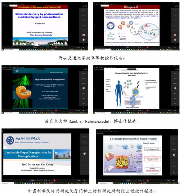 12月8日至10日,由西安交通大学生物医学光子学与传感器研究所与德国吕贝克大学生物医学光学研究所共同主办的2021年度中德合作与交流项目研讨会在线上顺利举行。本次研讨会主题为“激光诱导纳米颗粒辅助的生物分子和细胞改性研究”。来自德国吕贝克大学、伊尔梅瑙工业大学,西安交通大学、中国科学院海西研究院厦门稀土材料研究所、遵义医科大学(珠海校区)以及河南大学等高校、研究单位的专家学者围绕会议主题分享研究工作,共同探讨了激光在生物医学纳米技术方面新的发展前景与进一步的合作契机。