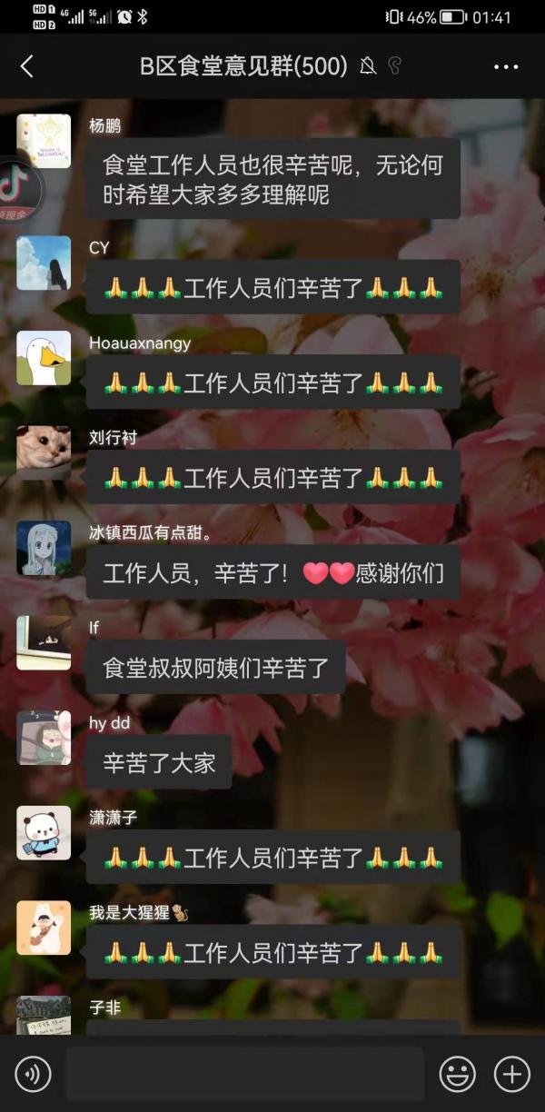 “工作人员辛苦了!”“泪目!”“感动!”“大家要互相理解呀!”“需要被子吗?我有多的!”“我有暖宝宝,一会儿送来!”听说这个消息,交大学子不仅自发在各个食堂意见群里“排队”发言,表达自己对食堂和后勤工作人员的问候与感谢,还贴心询问是否需要被褥,更有热心人送来了暖宝宝,生怕工作人员受寒。各餐饮公司也为核酸检测人员免费送餐,提供汤圆夜宵……这些暖心的举措既是心贴心、实打实的关怀,也彰显了交大人团结一致,共同抗疫的决心!