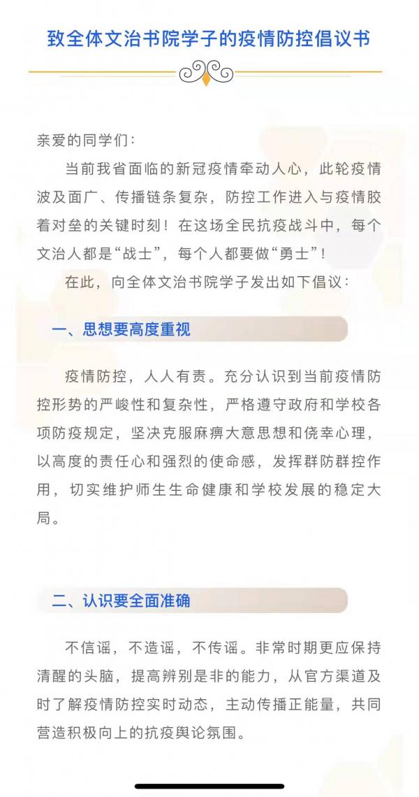 文治书院辅导员任欣写下了《告全体文治学子疫情防控倡议书》,号召同学们一切行动听指挥,勠力同心、从容应对。