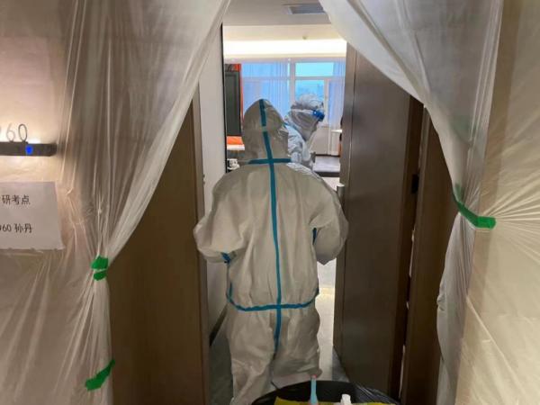 考研当日,隔离送考的监考老师需要身穿白色防护服,按疫情防控流程进入酒店或考生家中,严格按照国家研究生考试工作要求进行监考并全程录像。考试结束后需要密封试卷并进行消杀,交由送卷考务人员及时送达指定地点。这些流程说起来简单,但是做起来非常复杂。