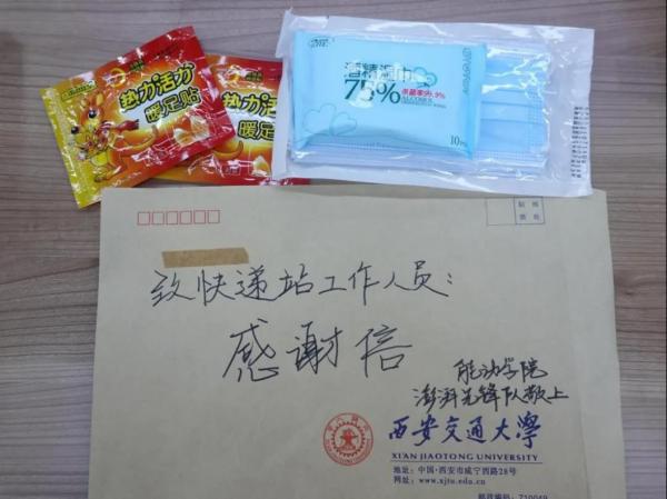 除权益物资组外,能动学院澎湃先锋队还建立了宣传联系组和心理疏导组。宣传联系组已在“交大能动研究生”开设“同心防疫”信息专栏,及时传递最新防疫资讯与学校后勤保障信息;心理疏导组依托学院公众号“交大能动研究生”的“心情树洞”栏目,开设“‘疫’不容辞,共克时艰”专栏,邀请同学们参与投稿,“最近我们的‘心情树洞’栏目会有一些同学们对疫情的感受,也会有大家对学校工作人员的感谢。”李彤介绍到。为了表达对工作人员的感谢,传达能动学子的心意,能动澎湃先锋队组织队员为在漫天大雪中辛勤工作的工作人员和志愿者们送去暖宝宝,同时也为在快递站日夜坚守的快递人员送去感谢信。“不仅为同学们服务,也为志愿者们服务”,这是澎湃先锋队的初心,也在刺骨寒风中营造了温暖互助,同心战疫的浓厚氛围。