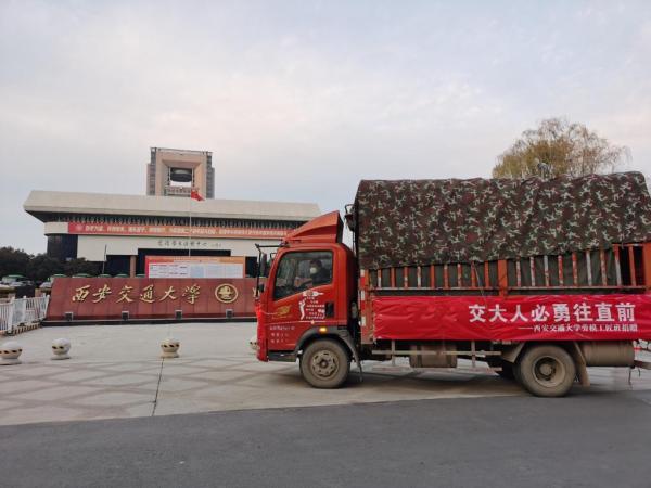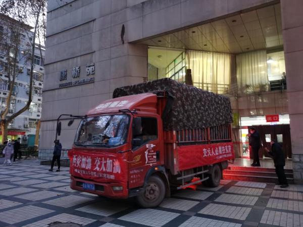 12月28日下午17:30,满载爱心物资的车辆从西安交通大学兴庆校区南门缓缓驶进校园,西安交通大学后勤饮食中心主任吴兴兵、副主任高鸿洲,继续教育学院院长邸德海到校门口迎接。