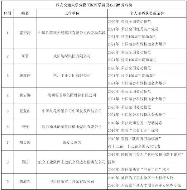 2020年初,陕西省总工会和西安交通大学签署战略合作协议,从全省劳动模范中选拔出45名参加考试并录取为西安交大现代远程(网络)教育首届陕西省劳模工匠班学员,学员包括2020年全国劳动模范、大国工匠张新停,赵梦桃小组组长何菲,“动车医生”“全国优秀党员”董宏涛等。2021年7月,继续教育学院特邀参加了庆祝中国共产党成立100周年大会的董宏涛、张新停、何菲同学为学院师生做党史学习教育专题报告。
