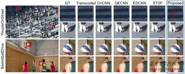以图像客观评价指标PSNR/SSIM增益作为客观评价指标衡量该论文方法较先前方法而言的增强性能提升程度。从表中可以看出,该论文提出的方法在测试视频序列的平均PSNR增益为0.782dB,相比于先前方法STDF而言提升增幅达52.4%。同时,图5为与先前单次编码修复增强方法的主观效果对比图,可以看出该论文方案主观质量大幅提升,如转码损伤的斑马线被修复还原,行人周围的伪影得到大面积移除,篮球的边缘纹理修复重现等。因此,该论文无论从客观指标和主观效果上都极大程度地修复提升了视频转码压缩后的视觉质量。