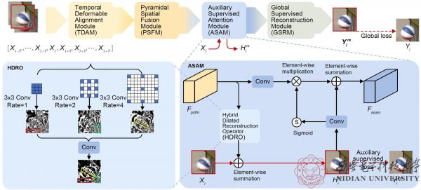 考虑到转码压缩视频中存在的伪影是多次编码失真的叠加,先前的处理方案主要针对单次压缩损伤的修复,当其应用于转码视频上效果大打折扣。为此,结合实际应用场景,该论文将深度学习与转码视频去伪影任务相结合,利用转码视频特性,将初始编码信息作为中间辅助监督标签,设计辅助监督和全局监督损失函数引导网络训练。同时,该论文结合视频的时空相关特性设计了包括时域可变形对齐模块(TDAM)、金字塔空域融合模块(PSFM)等在内的卷积神经网络架构,并协同辅助监督(ASAM)和全局监督(GSAM)训练以更好地提升转码视频的画面质量,对应网络架构图见图4。因此,通过论文方法,可以在不增加视频码率的情况下大幅提高视频图像质量。