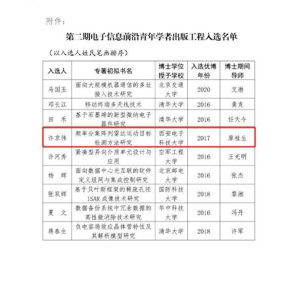 近日,由国务院学位委员会电子科学与技术学科评议组指导,中国电子学会和人民邮电出版社有限公司共同开展的第二期“电子信息前沿青年学者出版工程”评选结果揭晓。西安电子科技大学雷达信号处理国家级重点实验室许京伟副教授成功入选。