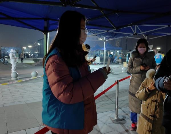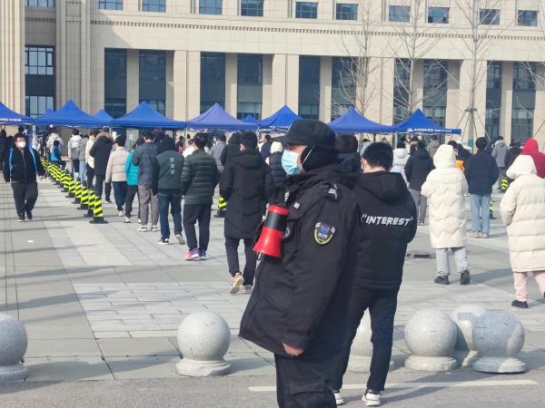 12月29日,正在核酸检测现场维持秩序的岳飞说:“我是学校保卫处的一名保安,自疫情暴发以来,我就承担了在核酸检测现场维持秩序的工作,在所有人的共同努力下,核酸检测的效率越来越高。看到同学们有序排队做核酸,我也很开心,我也有孩子,希望每一个孩子都能健康平安地长大,我们的付出都是值得的!西安加油!”