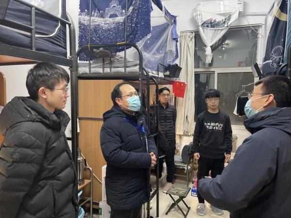 查显友、任小龙一行逐一查看了北校区所有学生公寓楼、实验楼、教学楼、办公楼情况,详细了解了封闭管理期间校园疫情防控和保障服务工作开展情况,看望慰问了跨年夜仍然坚守一线的工作人员,详细询问他们工作和生活存在的困难。查显友强调,当前疫情形势依然严峻复杂,要进一步落实落细各项防疫措施;要深入了解学生的思想动态和心理状态,排查解决学生在学习、生活中遇到的问题、困难;要引导学生理性看待各项防疫举措,支持配合属地、学校的各项防疫要求,全校上下齐心筑牢抗疫防线,坚定信心,同舟共济、共克时坚,全力以赴打赢疫情防控攻坚战。