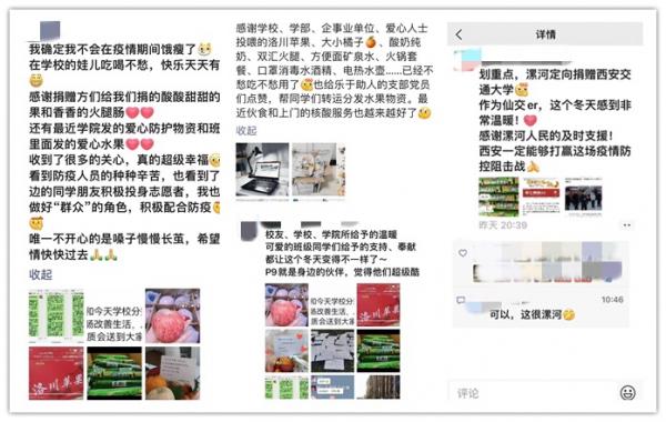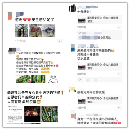 社会各界的爱心物资不断向交大涌来,同学们纷纷表达感谢、感动和感激之情,朴实的言语充满了正能量,展示出交大学子“饮水思源”的品格。来自社会各界的捐赠不仅鼓舞了研究生的士气,更在同学们心中种下向他人感恩、向榜样学习、向社会回馈的种子。