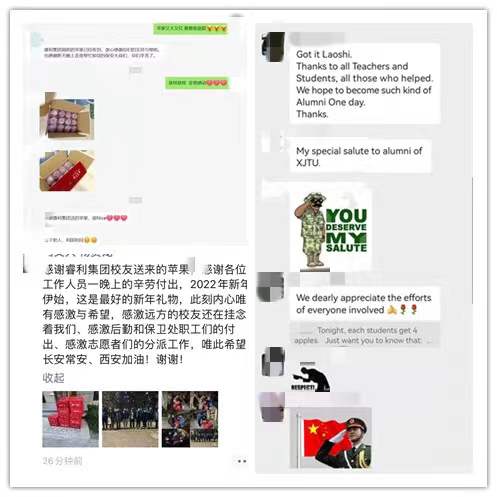 一批批爱心物资带来融融的暖意,为同学们的生活增添了一抹亮色和甜意。正如能动学院硕0034班的周璇在感谢信中所说的那样:“疫情隔绝不了爱,这一切的一切惊喜又感动,感动之余更多的是感谢与感恩。感谢学校与学院的用心组织、精心安排,校友的迅速筹集、慷慨驰援,感谢所有工作人员和志愿者的无私付出、传递爱心,感恩在寒冷的冬天送来的每一份温暖!希望新的一年,疫情和我们说再见,我们也可以踔厉奋发,笃行不怠,开启全新篇章!”