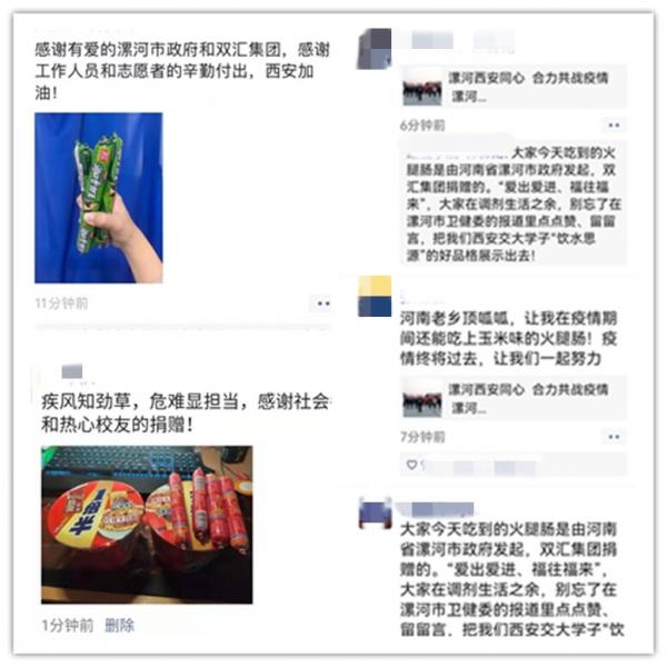 前沿院硕1190班张末提到:“疫情期间吃到火腿肠,太幸福了。双汇集团雪中送炭,原来我们不仅是父母的‘宝贝疙瘩’,也是学校、国家的‘掌心宝’!加油,交大人,定不负所望!”