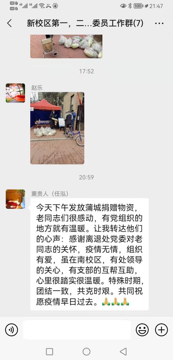 “有党组织的地方就有温暖。”在南校区领到物资的老同志深受感动,通过支部书记表达了心声,“疫情无情,组织有爱,虽在南校区,有处领导的关心,有支部的互帮互助,心里很踏实很温暖。特殊时期,团结一致,共克时艰。共同祝愿疫情早日过去。”