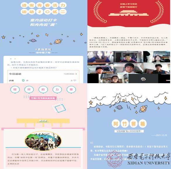 在老师们的组织带领下,学生团队各显所长,为同学们的“花式居寝”增添色彩。辅导员李恩慧老师组织书院团工委开展的西电首场党史主题“红色剧本+”在竹园3号书院上演,“云端”学习党史在疫情下砥砺前行,同时她带领学习发展中心的小导师推进线上小导师助学模式,依托腾讯会议平台开展,保障疫情防控期间同学们的学习需求;辅导员郑宇老师指导书院文创团队用画笔表达感恩,画出疫情下“白蓝红”们的身影,同时,她组织了书院的室内运动打卡活动,号召同学在宿舍内进行简便易行、科学有效的健身,保持身心健康;书院办公室杨勇刚老师带领书院公共团队制作阿竹“送饭神器”,解决同学们的送饭难题;办公室许海月老师带领正弦新媒体工作室,深入辅导员和志愿者的工作中,开设“共克时艰”线上专栏,报道身边的志愿者故事,发掘抗疫中的感人瞬间。