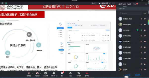 谢琨从教学实际使用出发,对建课、互动、西电课堂直播等环节进行了详细的讲解。从个人建课到团队协作建课、从随堂提问到有效互动、从作业发布到课堂直播,现场对平台操作进行演示,并与线上参会老师进行课堂互动和交流。本科生院常务副院长苏涛教授对现阶段开展线上教学和后续开展混合式教学的优势进行分析,并对线上教学提出工作要求。他讲到,本次线上教学要在正常在线授课的基础上,提高教学效率与质量,贯彻教育部对线上教学提出的实质等效要求,尽量减少疫情对教学的影响。西电智课平台作为学校建设的智能化学习平台,智能化教学辅助功能不断完善,不仅便于教师日常开展教学活动、及时调整教学方案,而且能够减少教师重复性工作,将教师解放出来去讲授更深入的知识,提升人才培养质量和创新能力,助力建设高质量课程。学校可以通过平台对整个教学过程进行监管和评估,这也是2022年进行本科教学审核评估关于线上教学的基本要求。