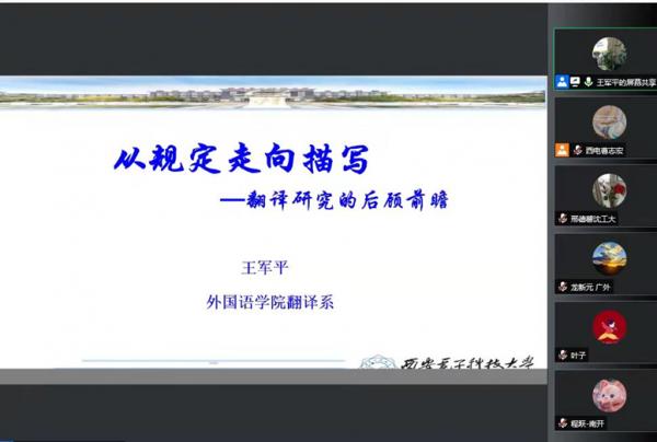 为响应学校“抗疫不停研”的号召,1月5日外国语学院王军平教授做了题为“从规定走向描写——翻译研究对后顾前瞻”的线上学术报告,校内外380余名师生参与,报告会由外国语学院曹志宏副院长主持。