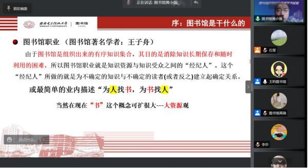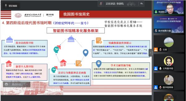 随后,馆长李团结、副馆长黄小强、研究馆员康延兴、助理馆员任佳艺、赵可彤分别从不同角度切入,就我国图书馆简史、疫情期间线上服务、馆藏各类资源的使用等主题进行汇报。本次会议获得了广大师生的密切关注,图书馆全体馆员以及200多名师生参会并听取报告。