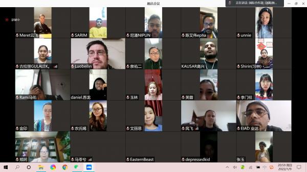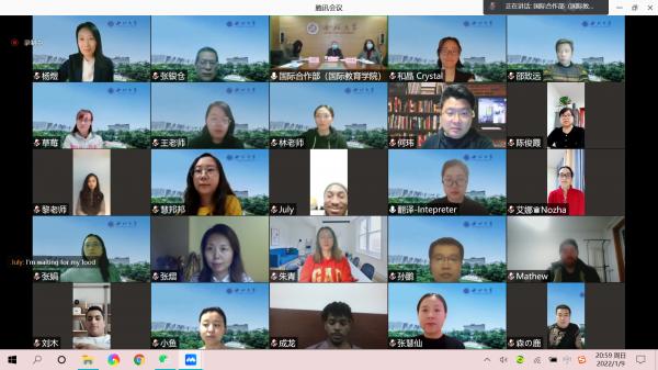 郭立宏首先代表学校向全体外籍师生和国际合作部(国际教育学院)教职员工表示慰问,对师生们克服困难、认真落实各项防疫政策表示充分肯定。他向师生们介绍了此次西安疫情的严峻形势、政府各级部门的抗疫举措、西安人民为抗击疫情所做的努力和成效及学校在疫情突发后的系列举措。他说,学校坚决把师生生命安全和身体健康放在第一位,成立了疫情防控工作领导小组、疫情防控工作专班和九个工作组,1600余名师生组成志愿者服务队;为保障师生的工作、学习和生活,学校扩容了宽带,开放免费在线学习套餐,紧急调配大量食品和生活物资等;国际合作部(院)也制定了疫情防控方案和紧急突发情况处置预案,在太白校区和云端线上,都有24小时值守的工作人员,服务外籍师生。