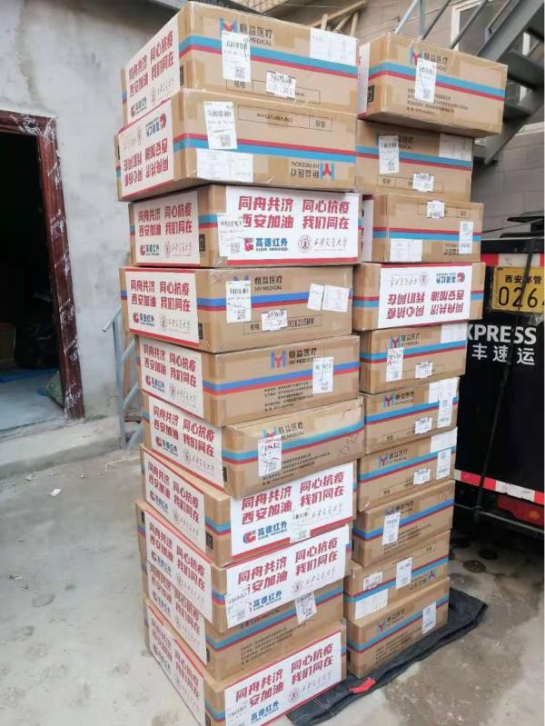 12月25日,武汉高德红外有限公司紧急采购2万只口罩和20箱消毒凝胶,并委托杭州朗索医疗由杭州连夜发货至西安。公司表示,在疫情防控的关键时刻,希望以爱心之举为学校的疫情防控尽一份绵薄之力,和学校共同筑起疫情防控的铜墙铁壁。
