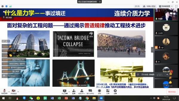 郑晓静院士表示,很高兴能够在这个特殊的时期为大家带来一场特别的报告。在得到学院的邀请后,她第一时间准备报告素材,希望通过漫谈的方式跟大家探讨力学研究。郑晓静院士深入浅出,从力学的历史和特点说起,娓娓道来,引人入胜。她用五个例子生动地展现力学的重要性,从十二位力学学科出身的国家最高科技奖获得者和著名的钱学森大师,到黑障、沙尘暴和极端力学,再到不同防护工具对于新冠疫情防控重要性的分析,表明力学已经渗透到生活中的方方面面。