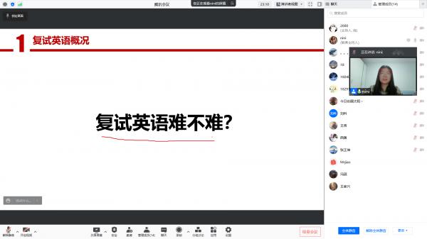 2022年1月8日,“网聚毕业生 云端促就业”系列讲座第三期举办,本次会议由任倩妮主讲,韩政隆主持。本次讲座主要聚焦考研口语辅导,机电院同学们积极参加,虽然是线上讲座,但师生之间的互动依然很活跃。