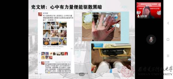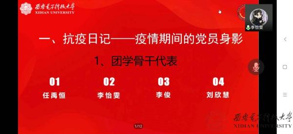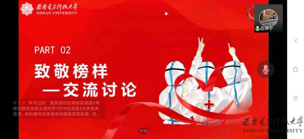 面对突如其来的疫情,我们也许曾经手足无措、担心惶恐,但是志愿者用行动向我们证明有一群人在守护西电、守护我们。2018级隔离宿舍带饭小分队负责人温琪分享了她的故事。疫情期间,她主动承担起为隔离宿舍同学、考研期间同学带饭的工作;青年党员志愿者代表狄鑫、沈怡敏讲述了他们站上一线,引导同学们核酸检测的故事。他们身着防护服,体会到医护人员的艰辛,他们与身边人携手并肩,以实际行动践行党员责任,在奋斗和奉献中唱响青春之歌,诠释出“请党放心,战疫有我”的人文心声。