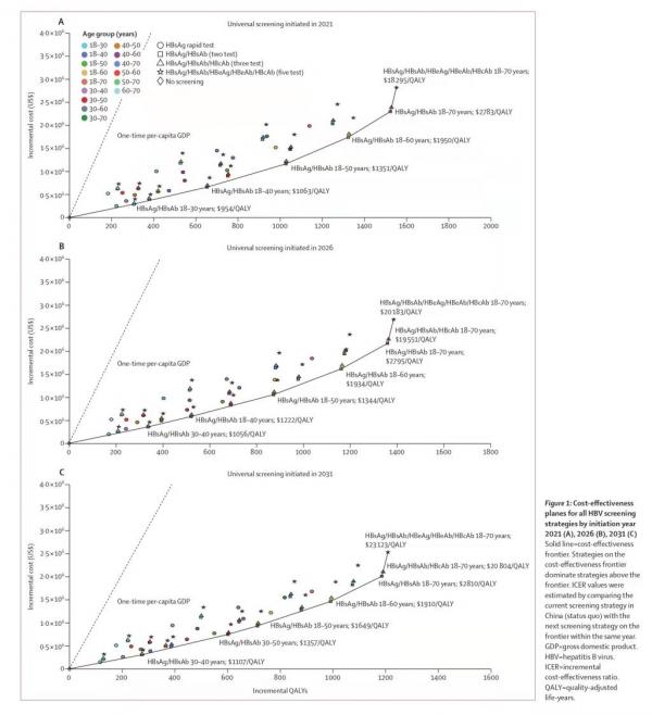 研究证实,中国在未来十年内对18-70岁人群通过乙肝两对半筛查方式进行乙肝筛查均为最佳策略。根据中国不同地区的预算水平,政府可选择低成本的策略,因为无论哪种策略较中国当前现实状况比较都具有成本效果,越早开展全民筛查收益越大。