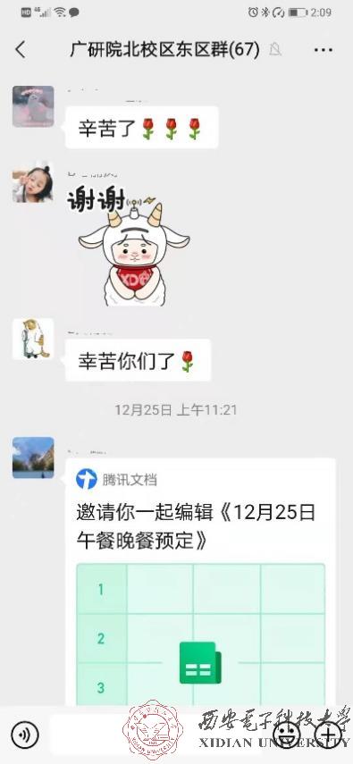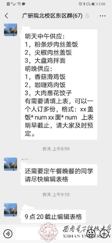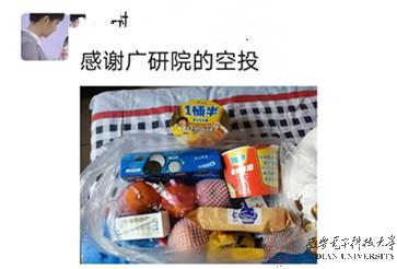 居住在北校区校内东区家属区的53名同学面临吃饭难问题,北校区校内同学成立“广研志愿者小分队”,制定配送方案,周到考虑细节,订餐、送餐、领餐和分发一个个步骤有条不紊地进行,散发着香气的饭菜在志愿者们的付出与奉献下,变得更加温暖。南校区里仅有一位同学居住在校园内,肩负起南校区家属区同学的送餐任务,有同学说,“咱们家属区实在做不了饭再让带饭,有条件的还是咱们自己备好食材做饭,他一个人来回跑也不方便”。疫情无情,人心却温暖。